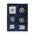 A gift set for offices. This office set is designed keeping in mind the corporate table and office life. This exquisite gift set contains 2 luggage tags for travels, 1 paper weight for the desk, 1 coaster, 2 glass covers, and 1 trinket box for post its or simple paper clips.
